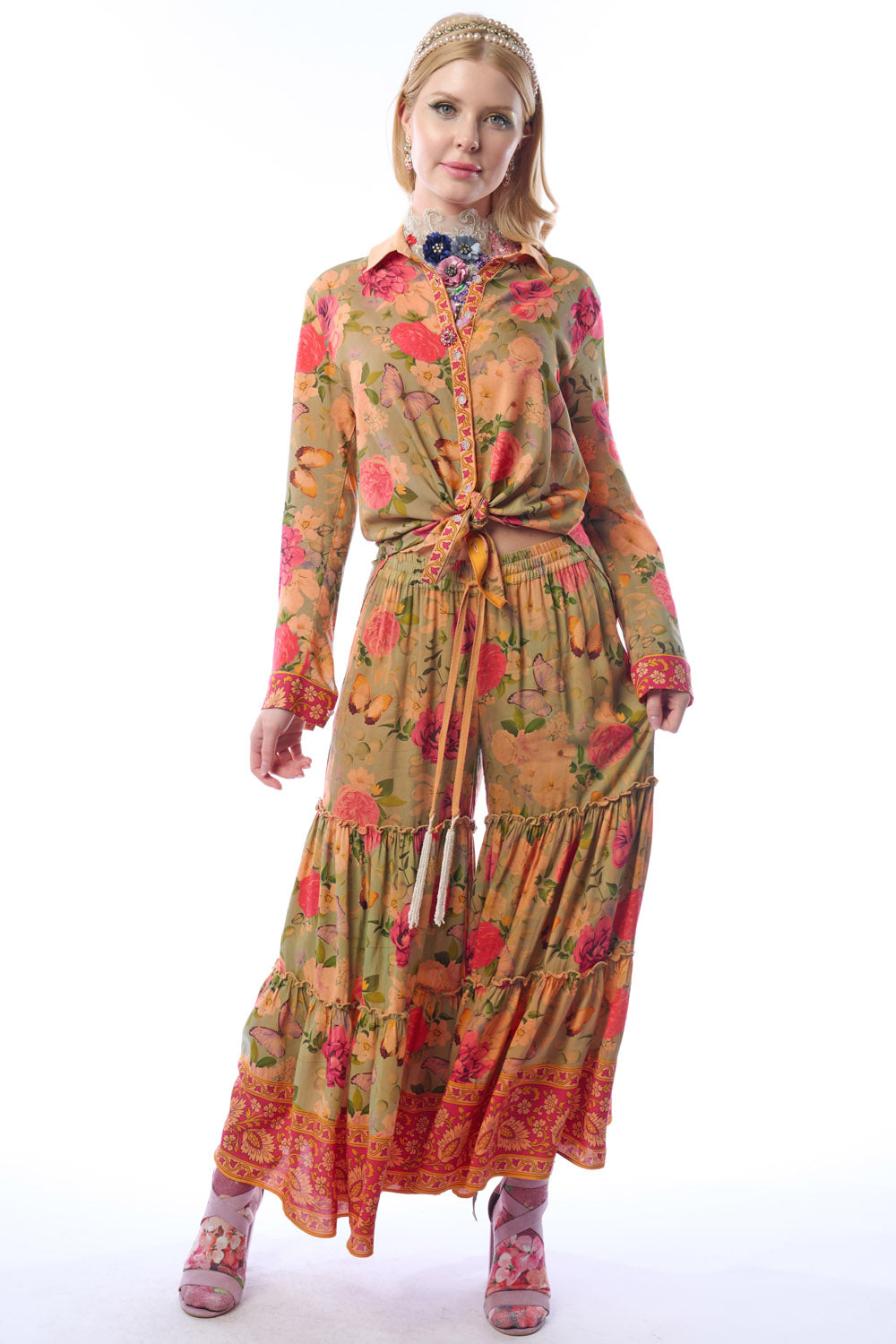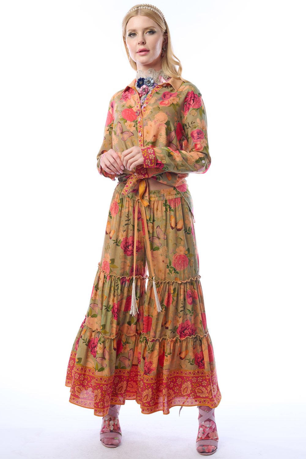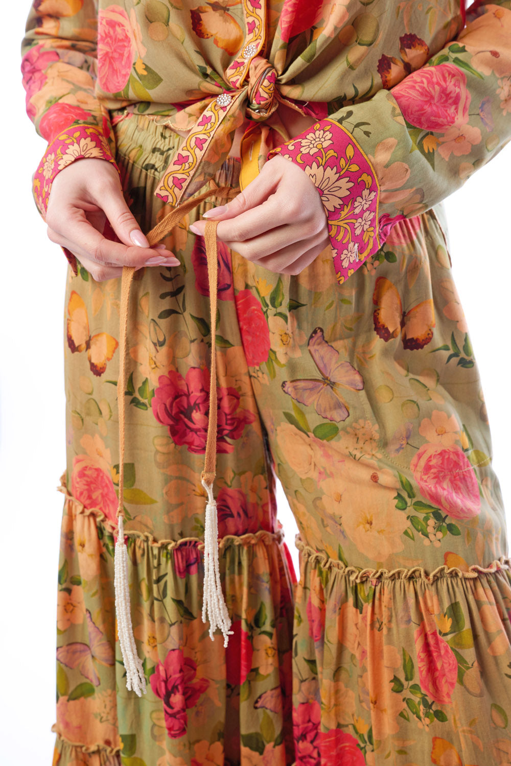 - Washed floral print elastic waist tiered hem palazzo pants with side pockets & beaded tassels attached to drawstring