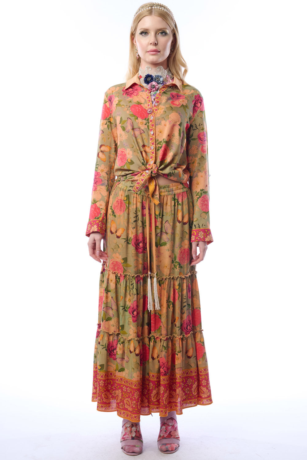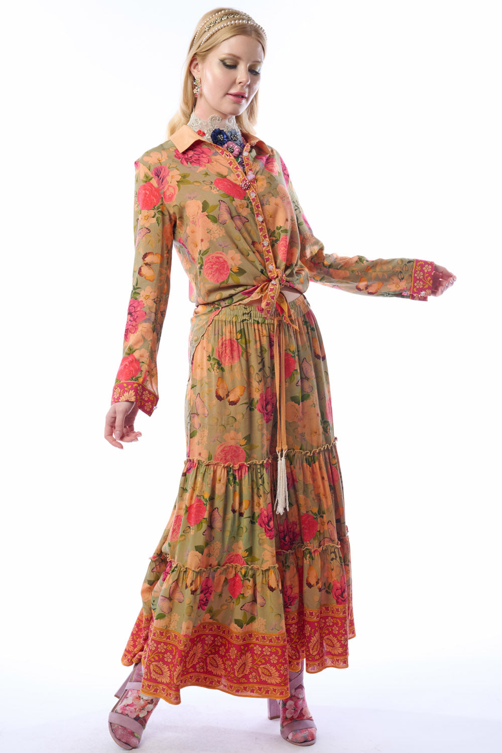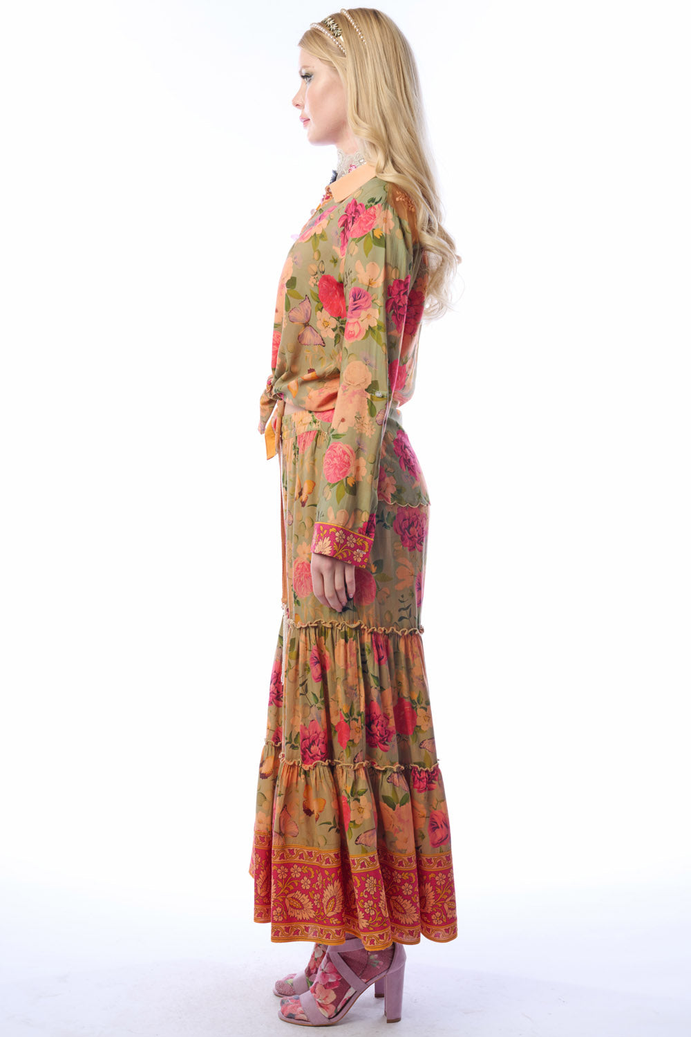 - Washed floral print elastic waist tiered hem palazzo pants with side pockets & beaded tassels attached to drawstring