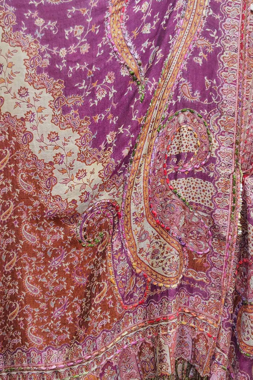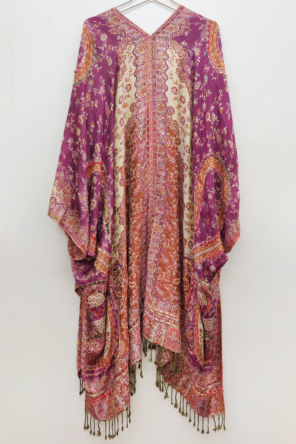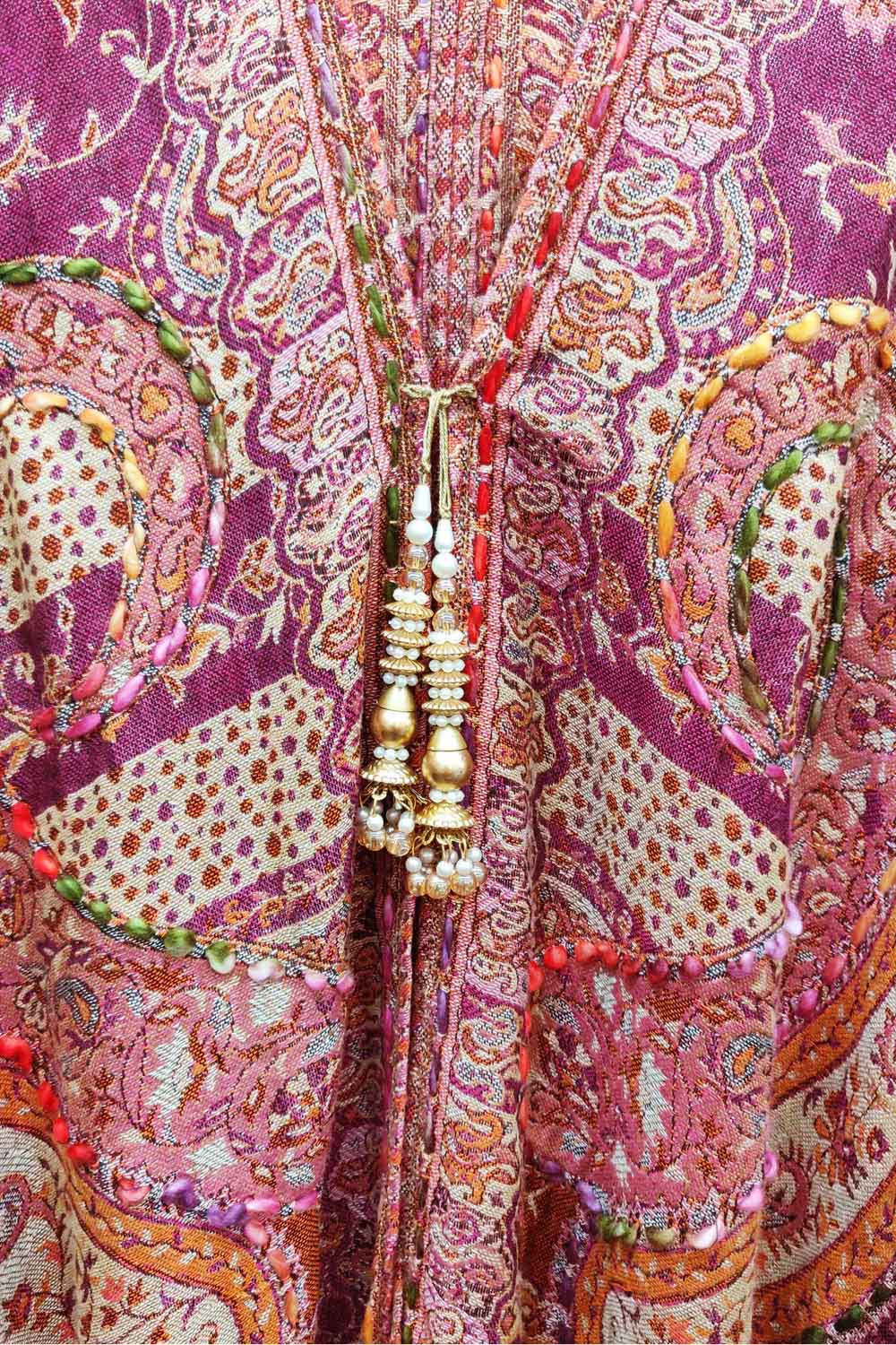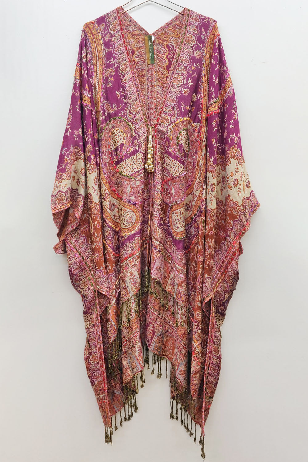 - Hand-stitched paisley floral print kimono with fringe hem, beaded pearl tassel closure on center front
