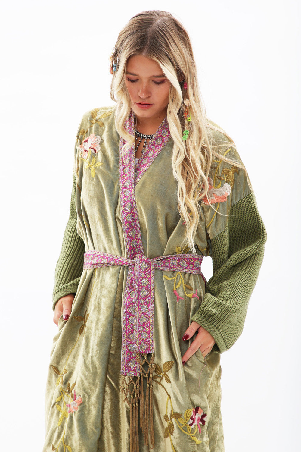 - Embroidered velvet coat with sweater sleeves & floral print contrast on belt CF/neck band & lining