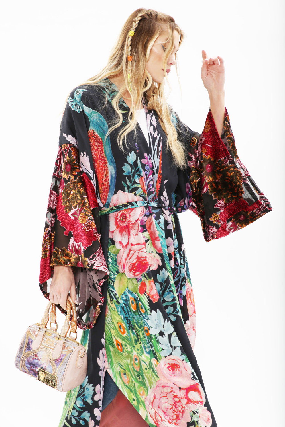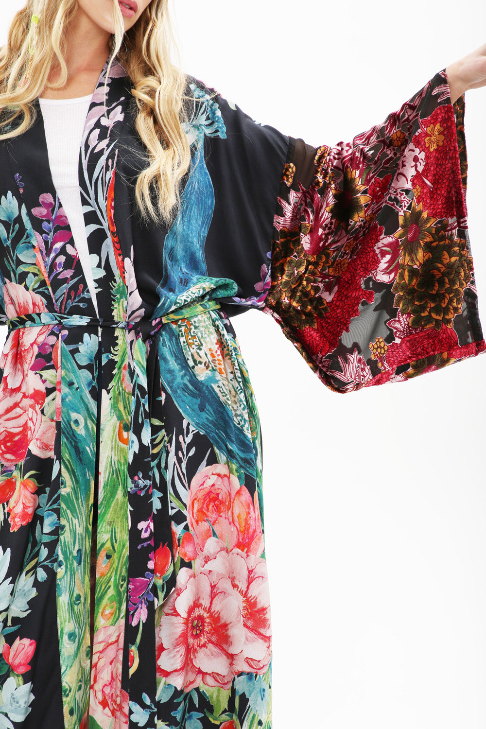 - Peacock floral print lined & belted kimono with burnout velvet sleeves