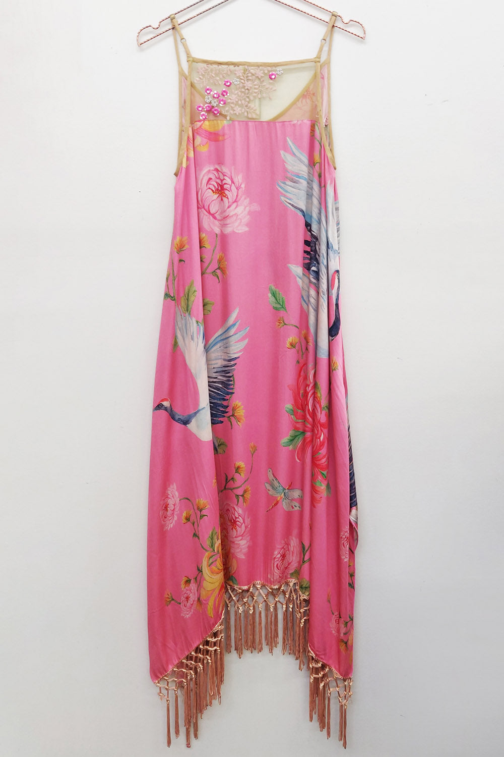 - Washed crane floral print adjustable strap dress, sequin embroidered mesh back yoke, knotted fringe hem