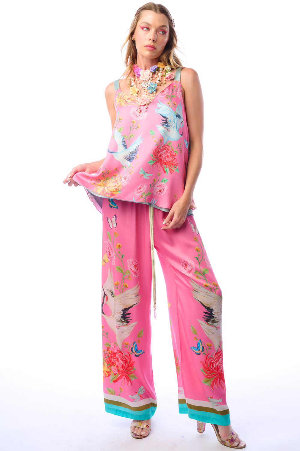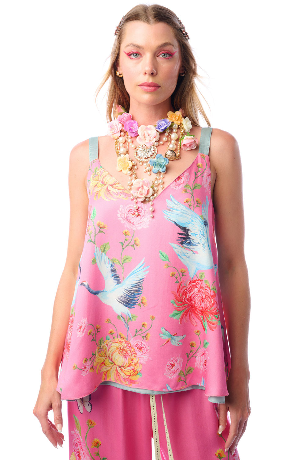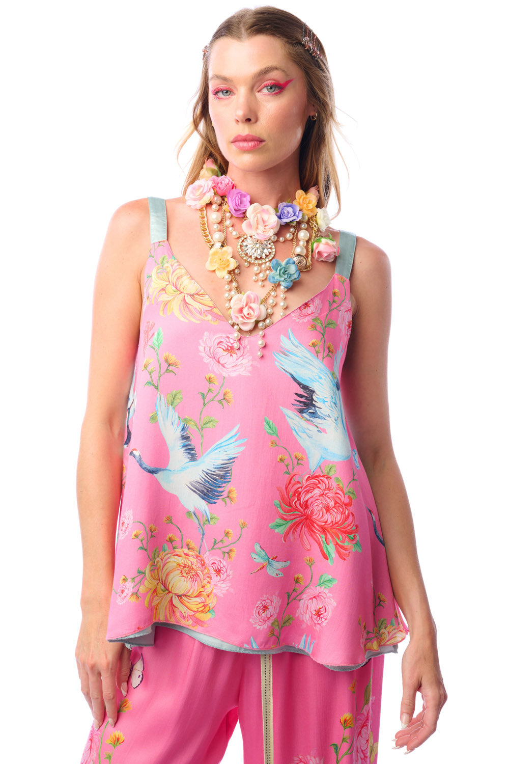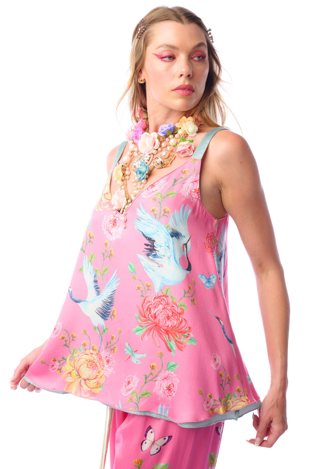 - Floral crane print cami with embroidered trim sewn on the reverse side of the straps, satin lining, can be worn reversibly