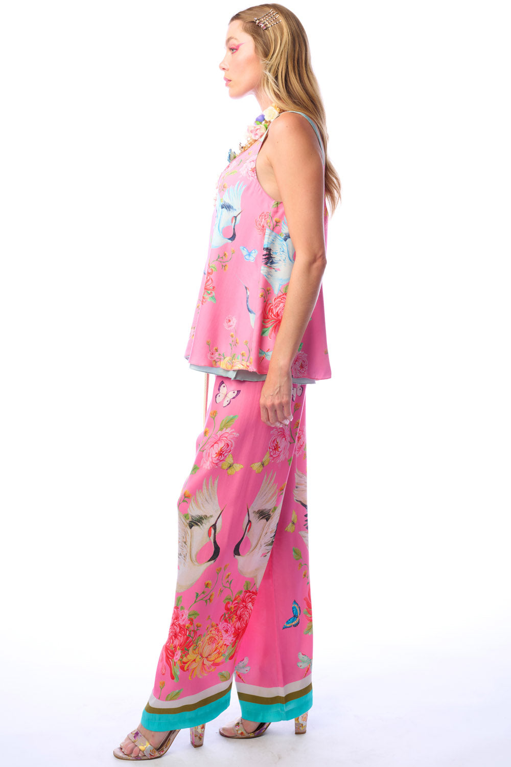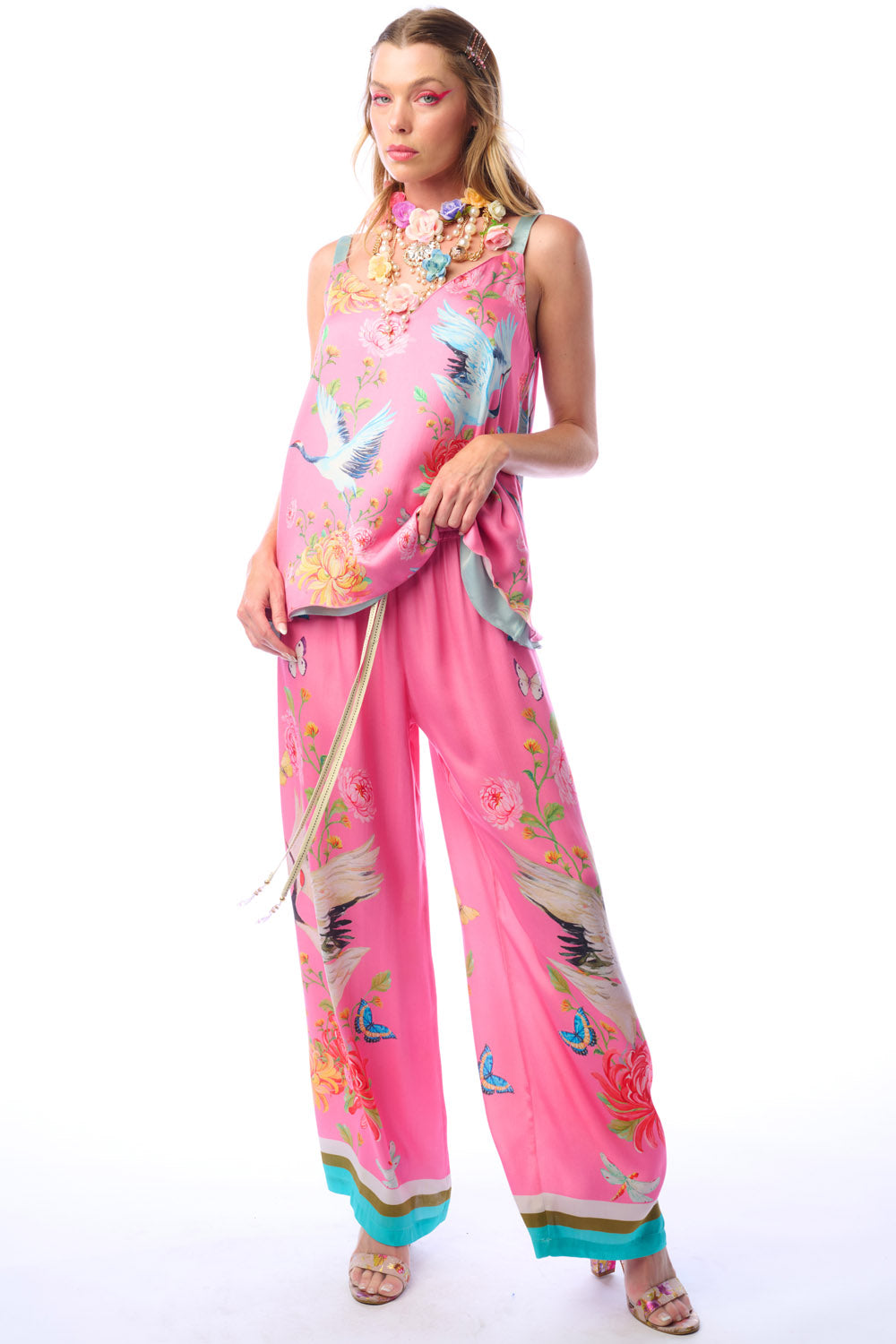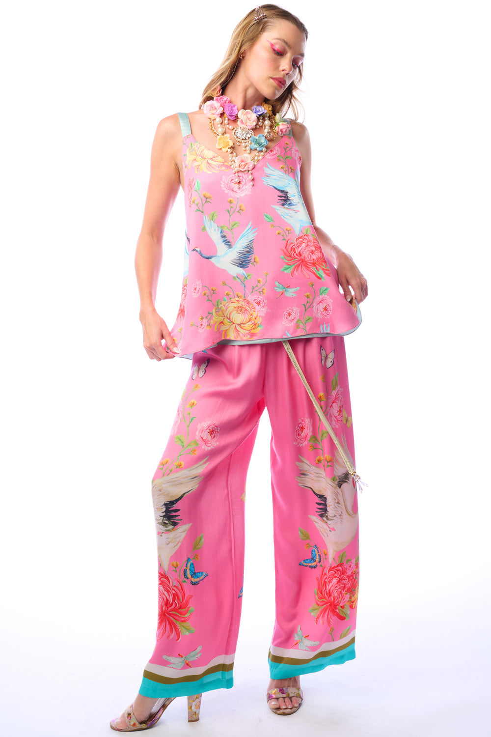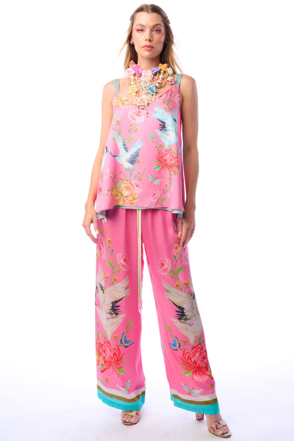- Floral crane print cami with embroidered trim sewn on the reverse side of the straps, satin lining, can be worn reversibly