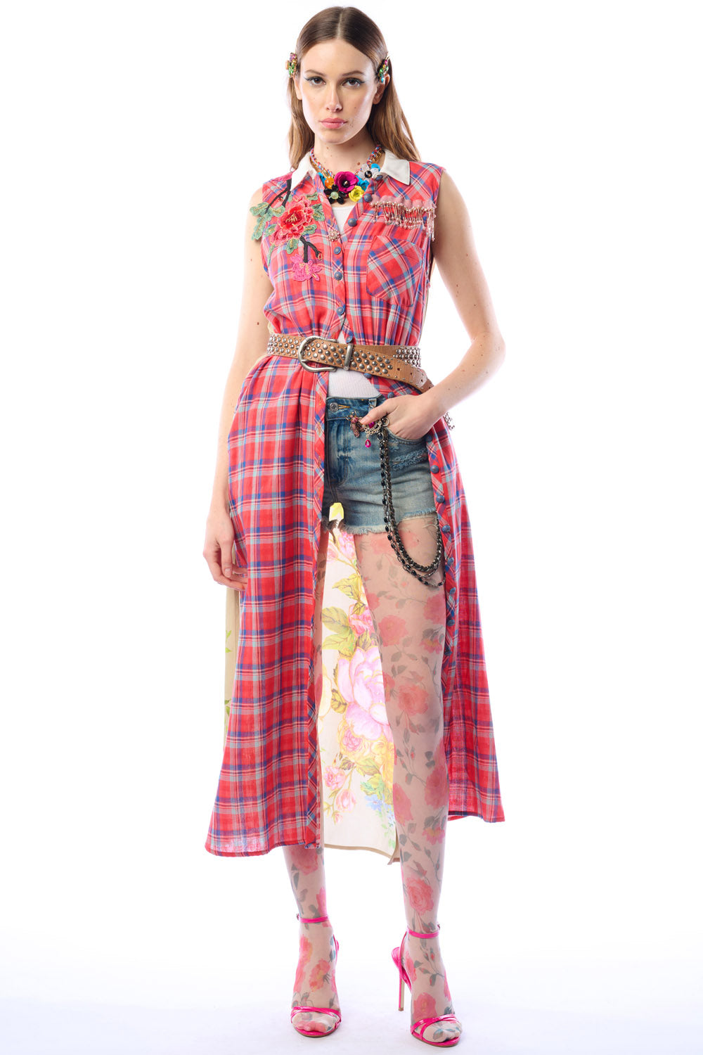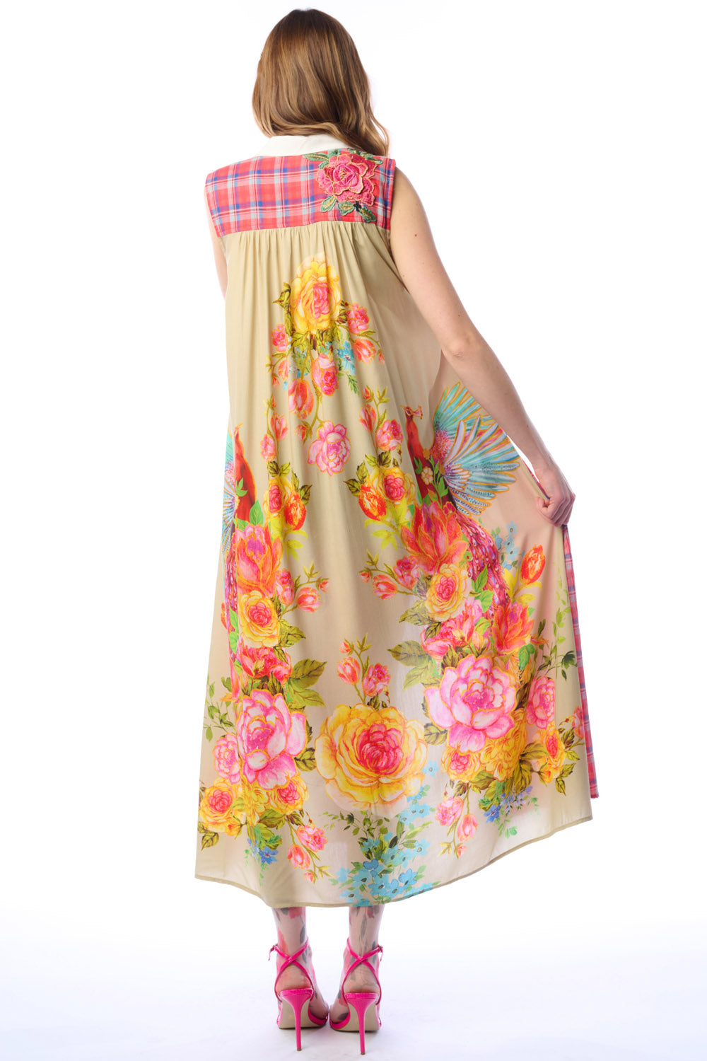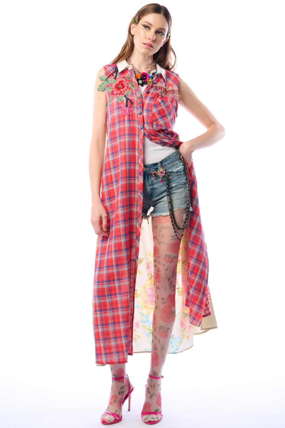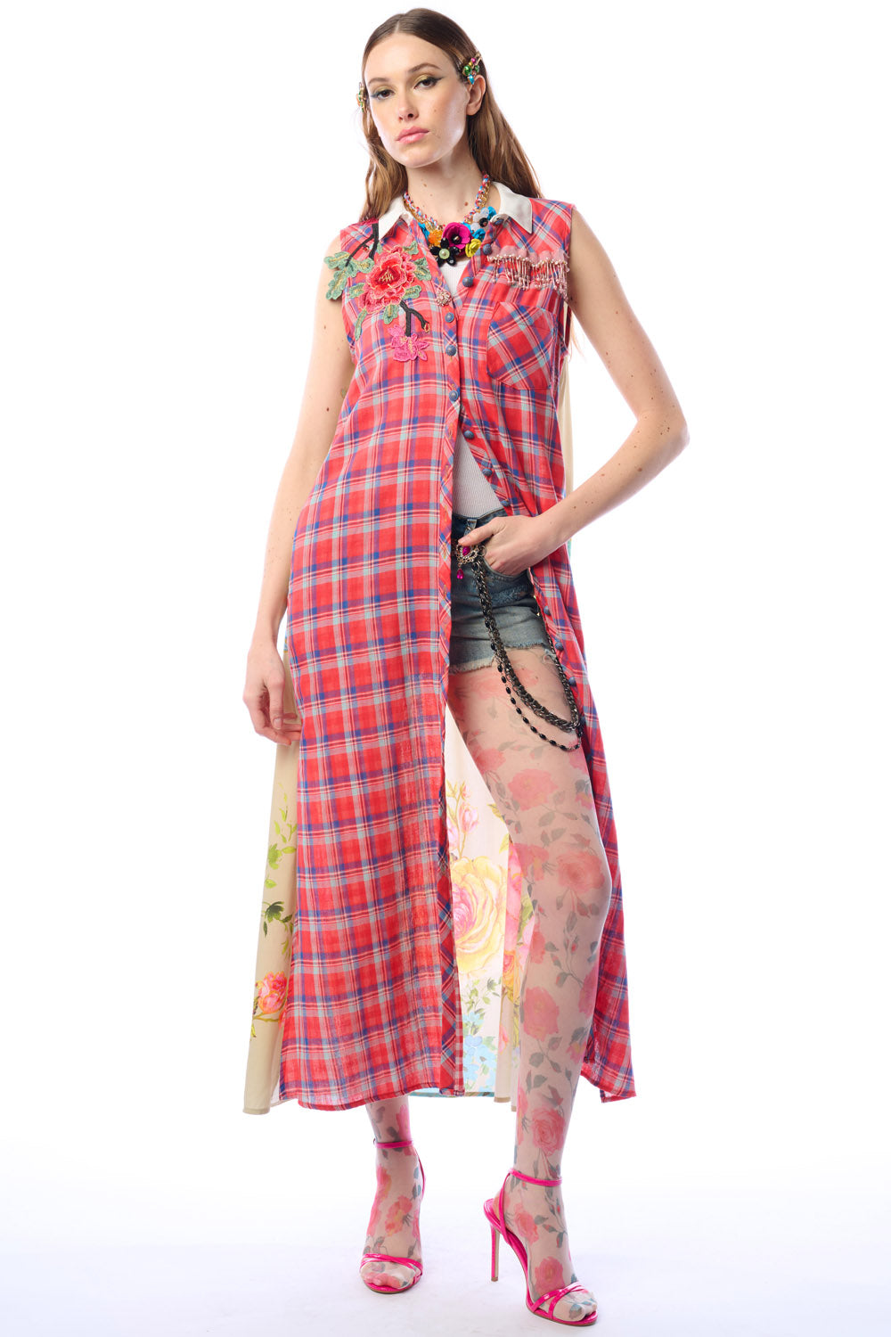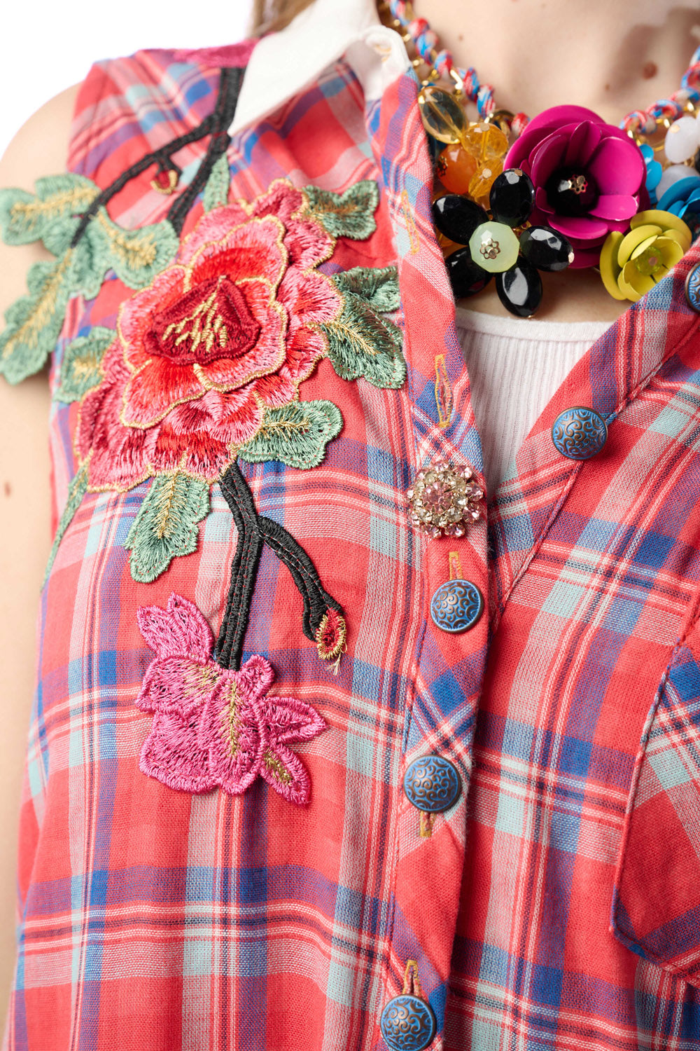 - Plaid sleeveless button-up duster with floral peacock print back, floral embroidered patch on right shoulder, above the left-front pocket with crystal tassel trim, CF placket with 1 decorative crystal button