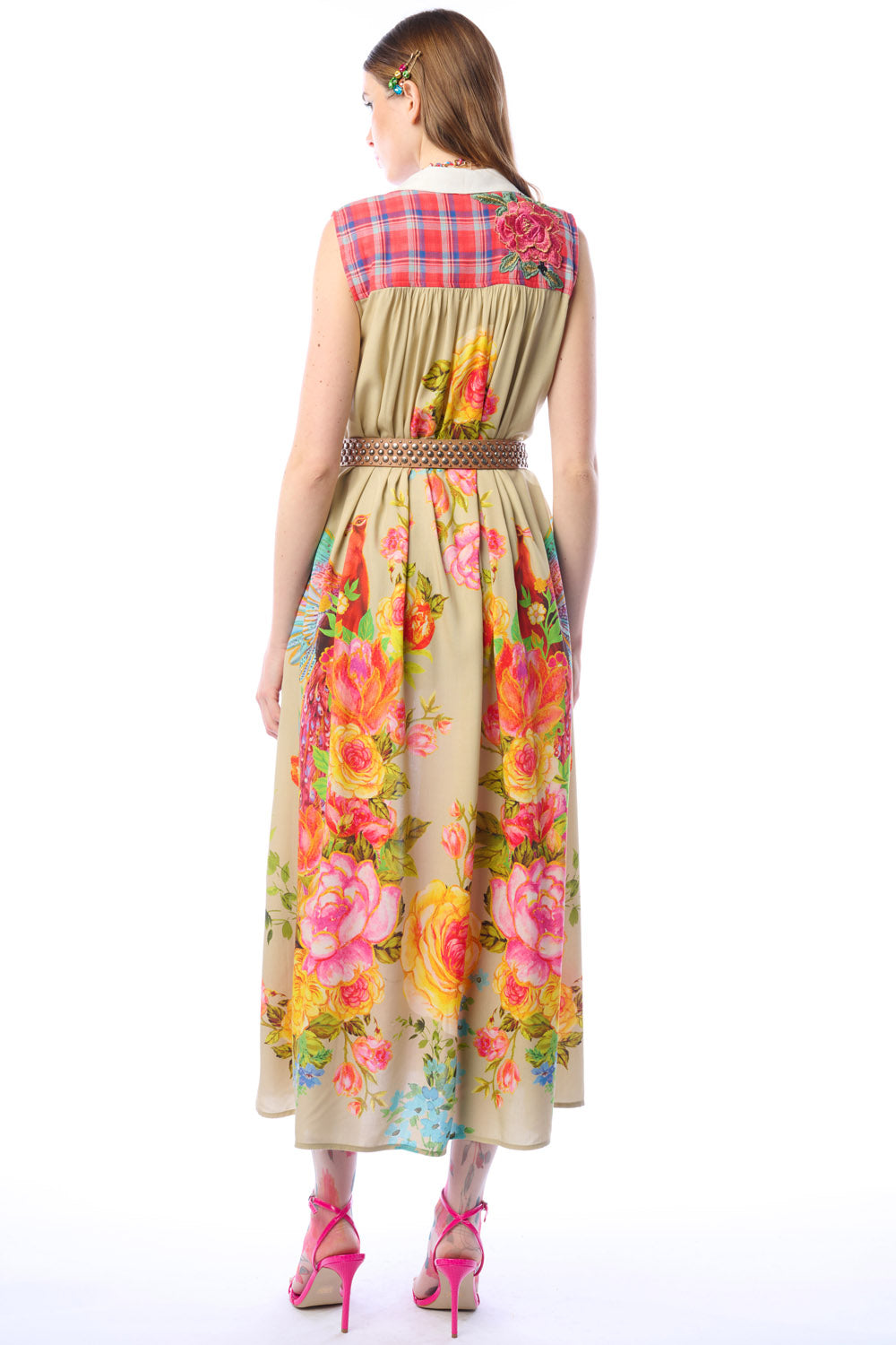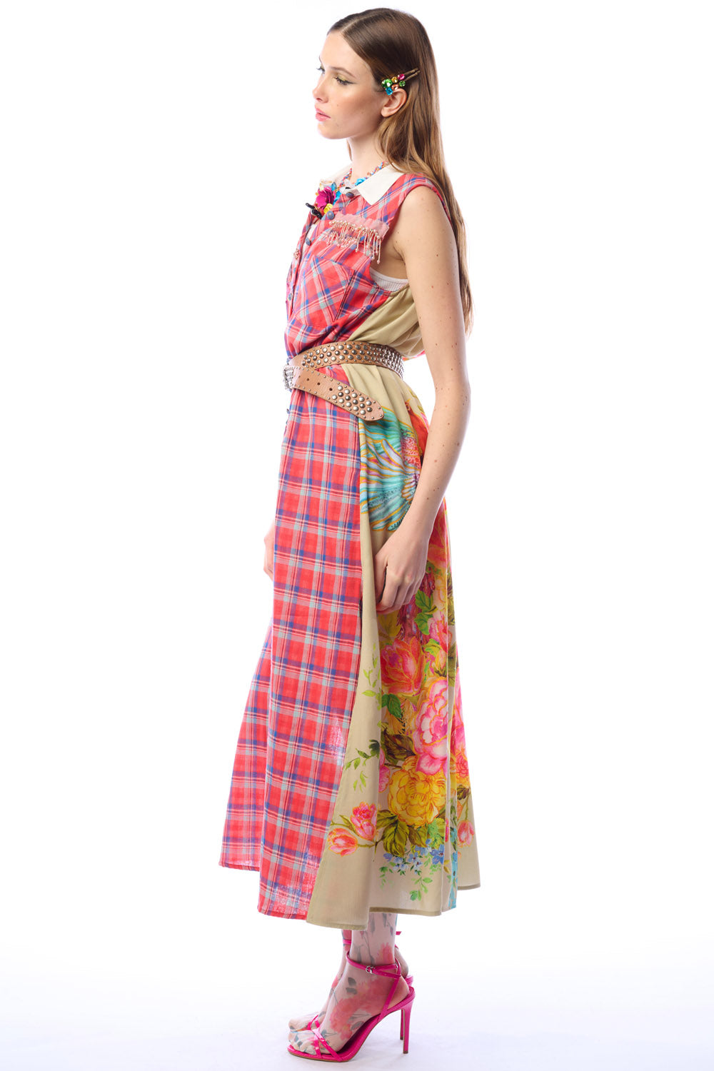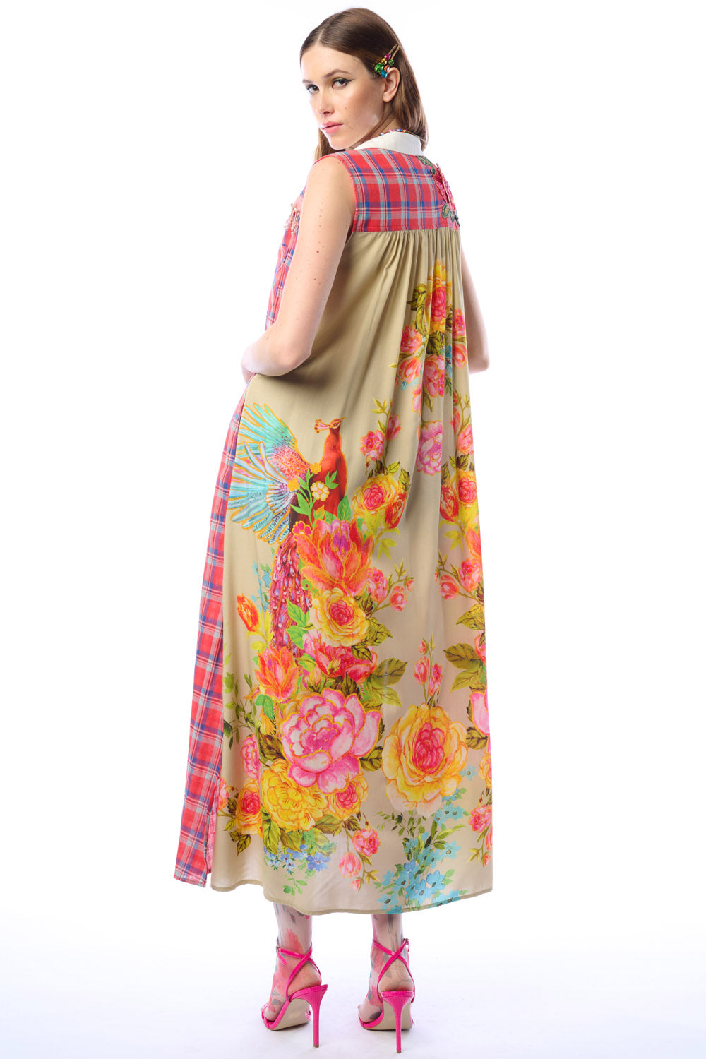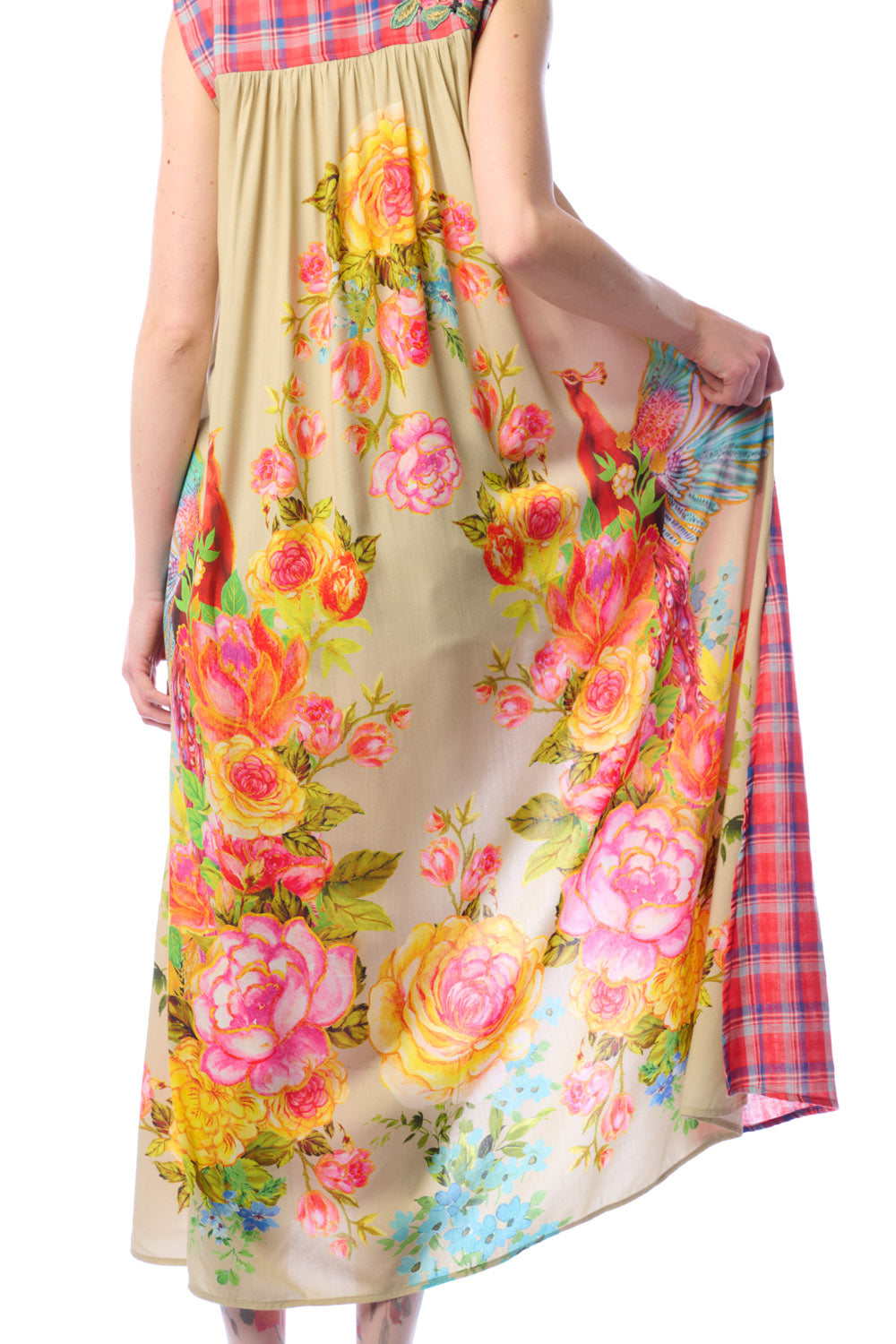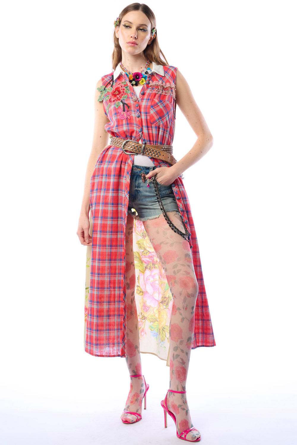 - Plaid sleeveless button-up duster with floral peacock print back, floral embroidered patch on right shoulder, above the left-front pocket with crystal tassel trim, CF placket with 1 decorative crystal button