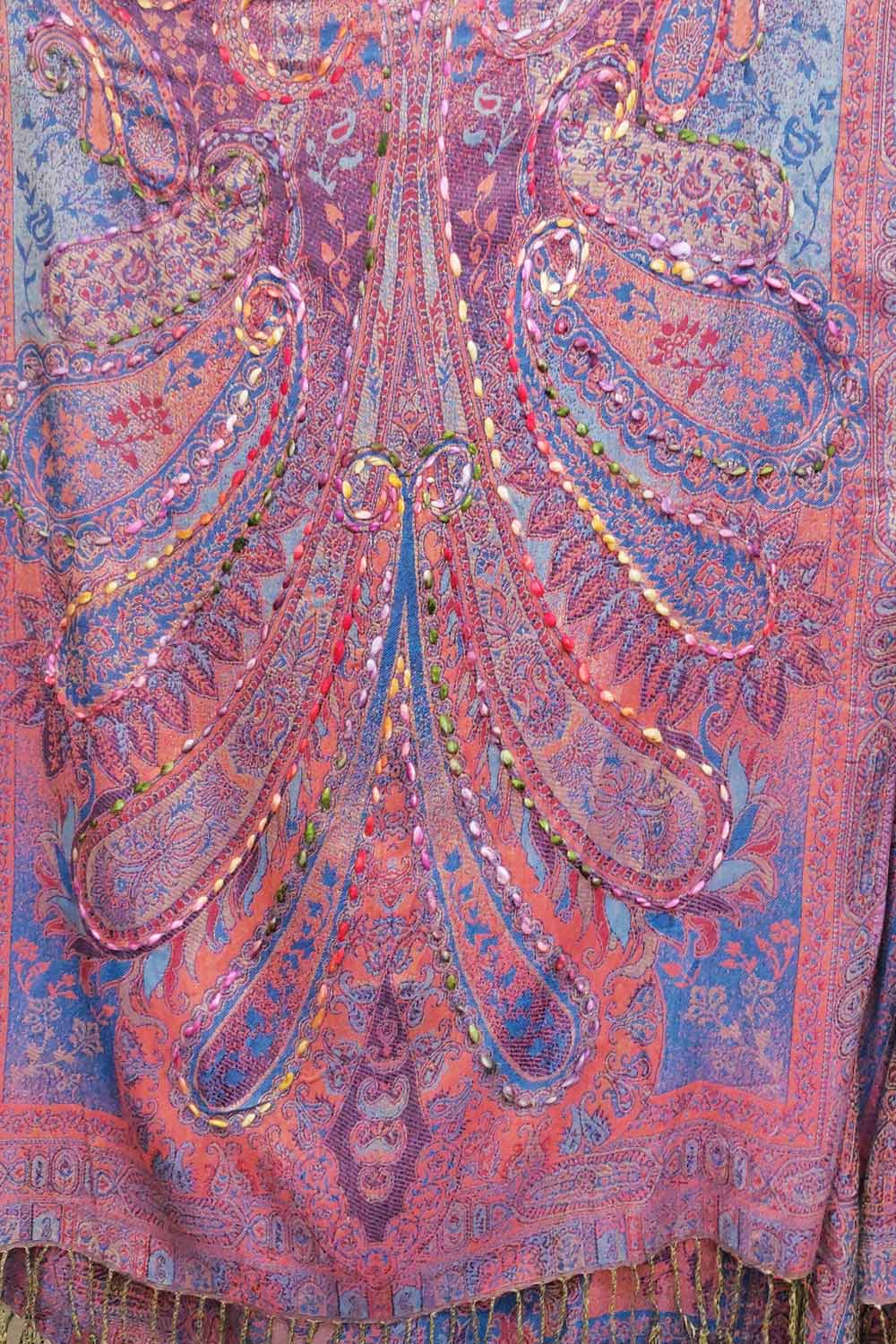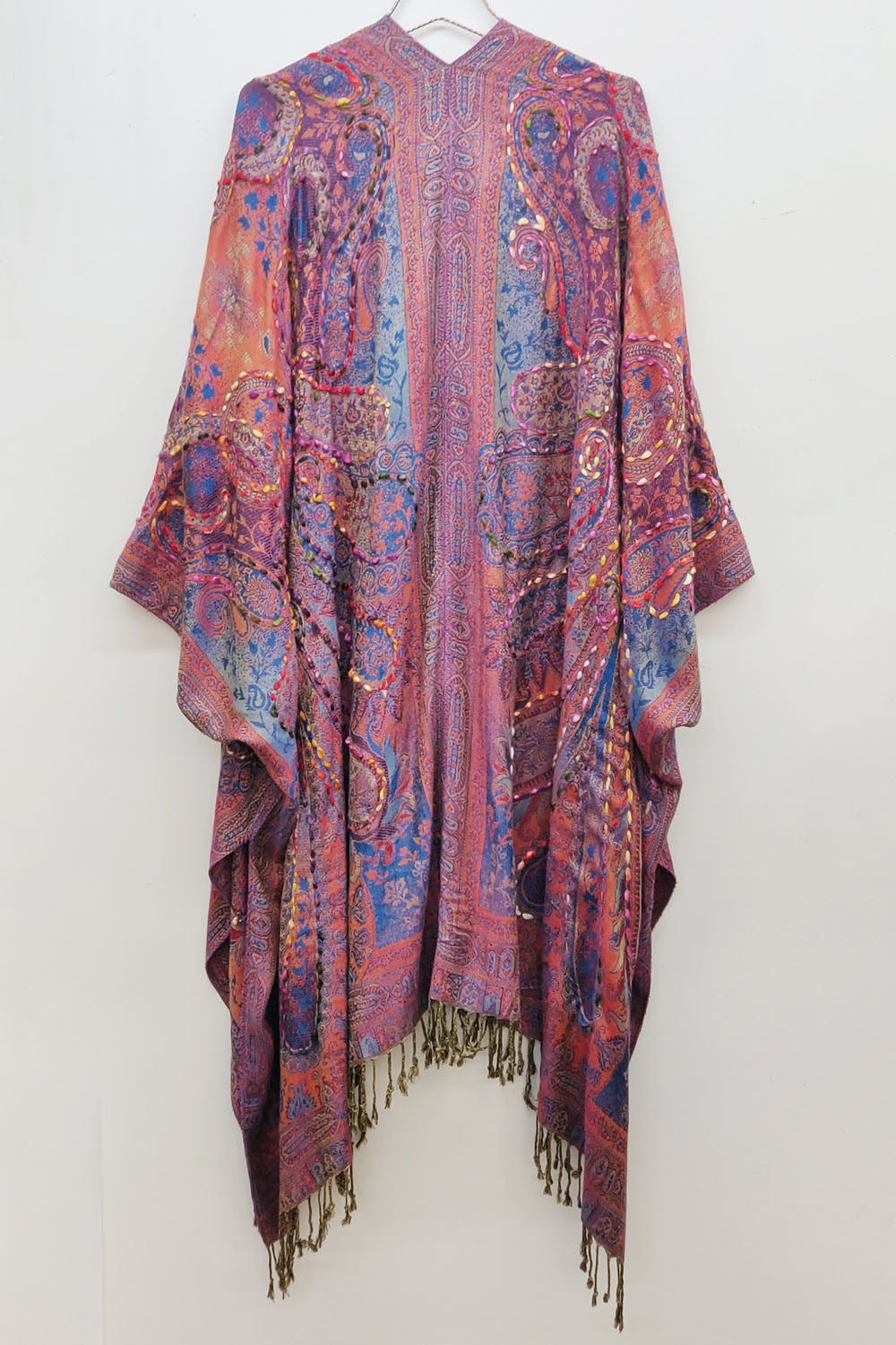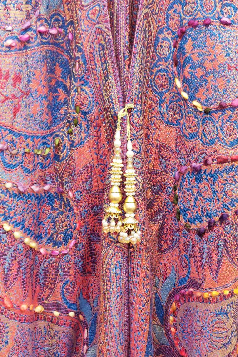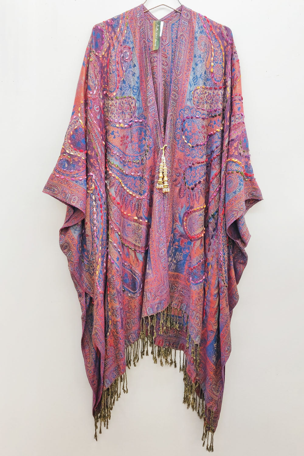 - Hand-stitched paisley floral print kimono with fringe hem, beaded pearl tassel closure on center front